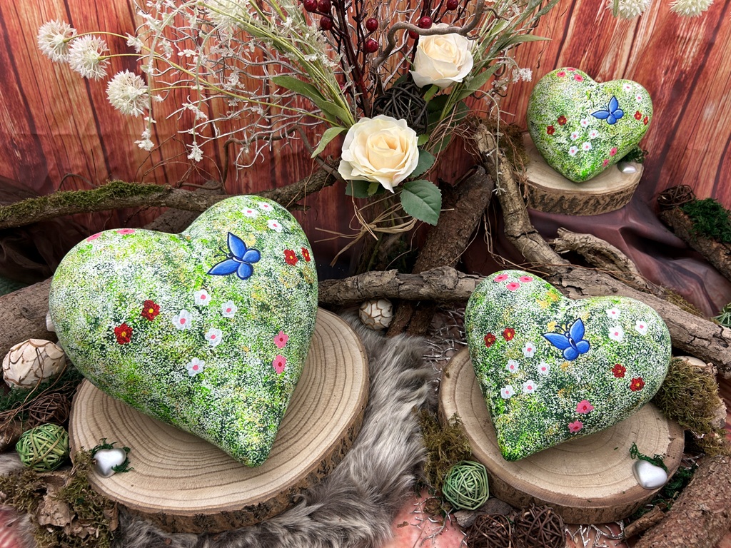 Tierurne Innenbereich - Herzform, von Künstlerhand mit einer Blumenwiese + Schmetterling bemalt, Volumen: ca. 0,55 Ltr.