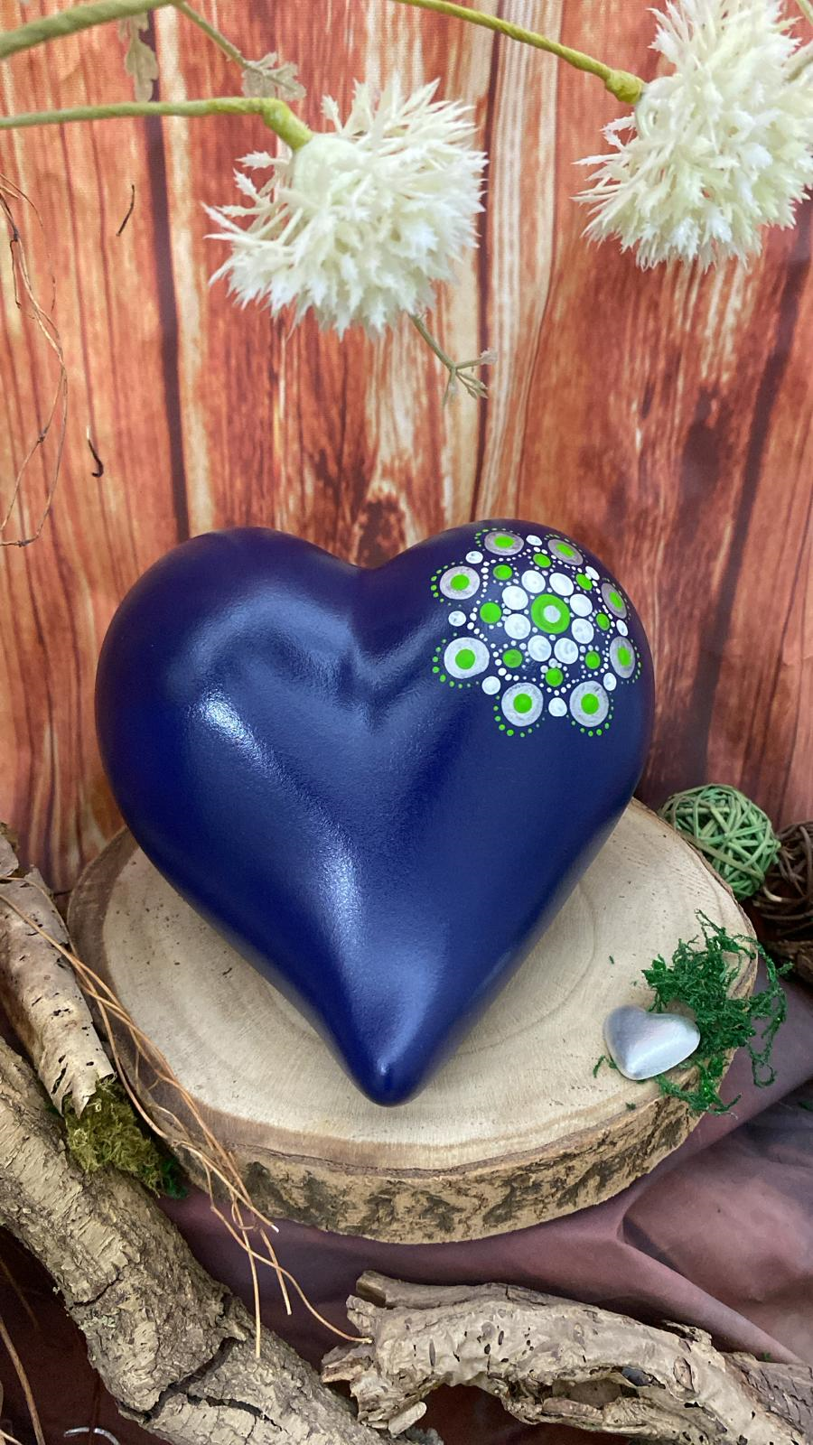 Formschönes und zeitloses Keramikherz, halbstehend, von Künstlerhand mit einem Dotpaint-Motiv veredelt. An der Stellfläche befindet sich der Verschlussdeckel (Material und Farbe identisch).