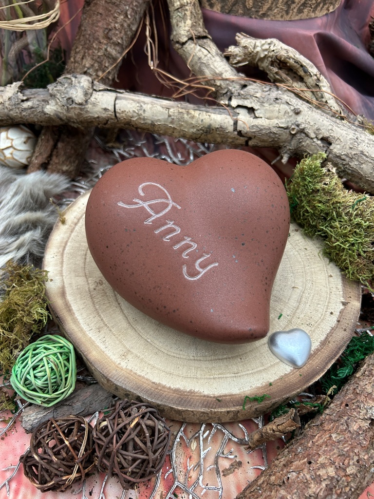 Handgefertigte Keramikurne in Herzform mit einer eingearbeiteten Pfote für den Außenbereich. Diese Tierurne ist frostsicher und witterungsbeständig und somit perfekt für das Aufstellen im Garten, auf dem Balkon oder auf der Terrasse geeignet.