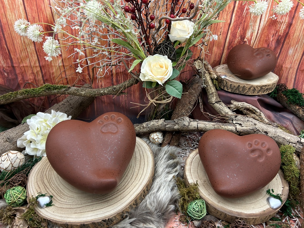 Handgefertigte Keramikurne in Herzform mit einer eingearbeiteten Pfote für den Außenbereich. Diese Tierurne ist frostsicher und witterungsbeständig und somit perfekt für das Aufstellen im Garten, auf dem Balkon oder auf der Terrasse geeignet.