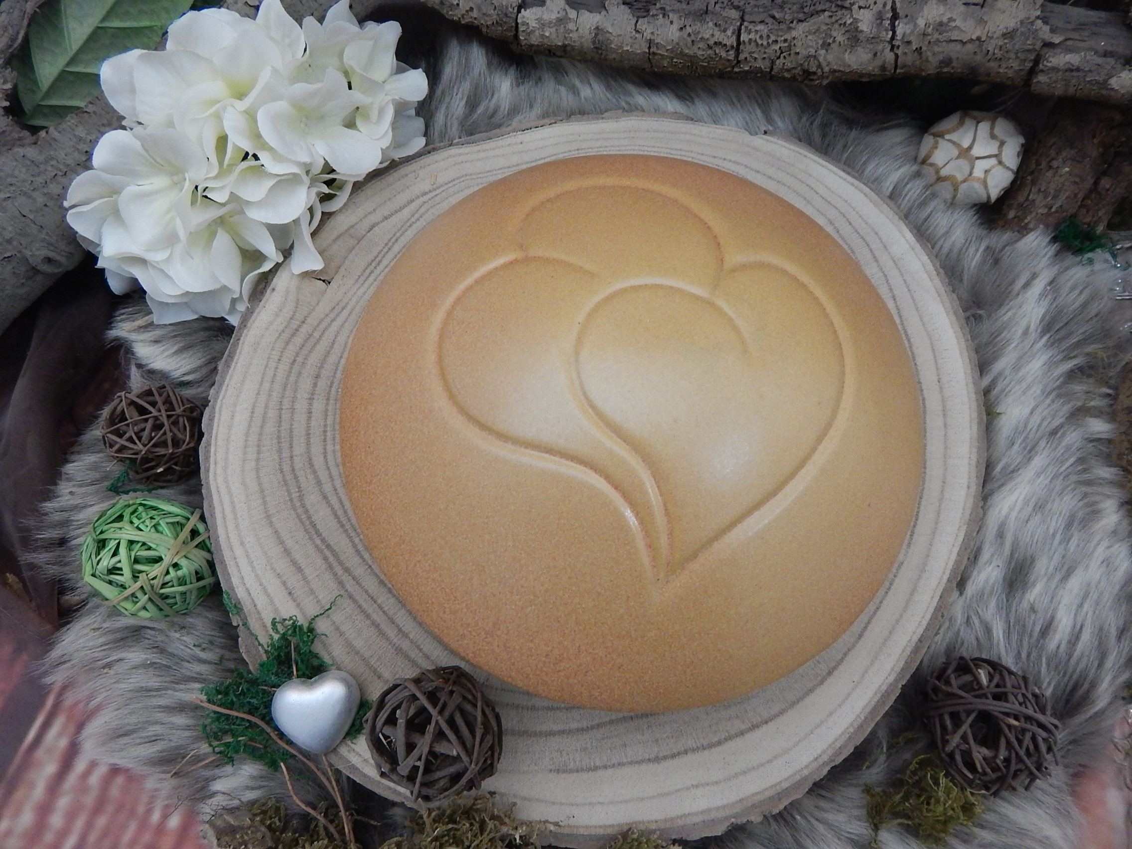 Wunderschöner Diskus, frostsicher und witterungsbeständig mit Doppelherz. Keramisch von Hand gefertigt. Jede Tierurne ist durch die Glasur und den hohen Brand ein Unikat! An der Stellfläche befindet sich die runde Einfüllöffnung. Verschlossen wird sie mit einem Verschlussdeckel aus gleichem Material und Farbe. Aufgrund der Produkteigenschaft können Sie die Tierurne im Garten, auf dem Balkon oder auf der Terrasse aufstellen.