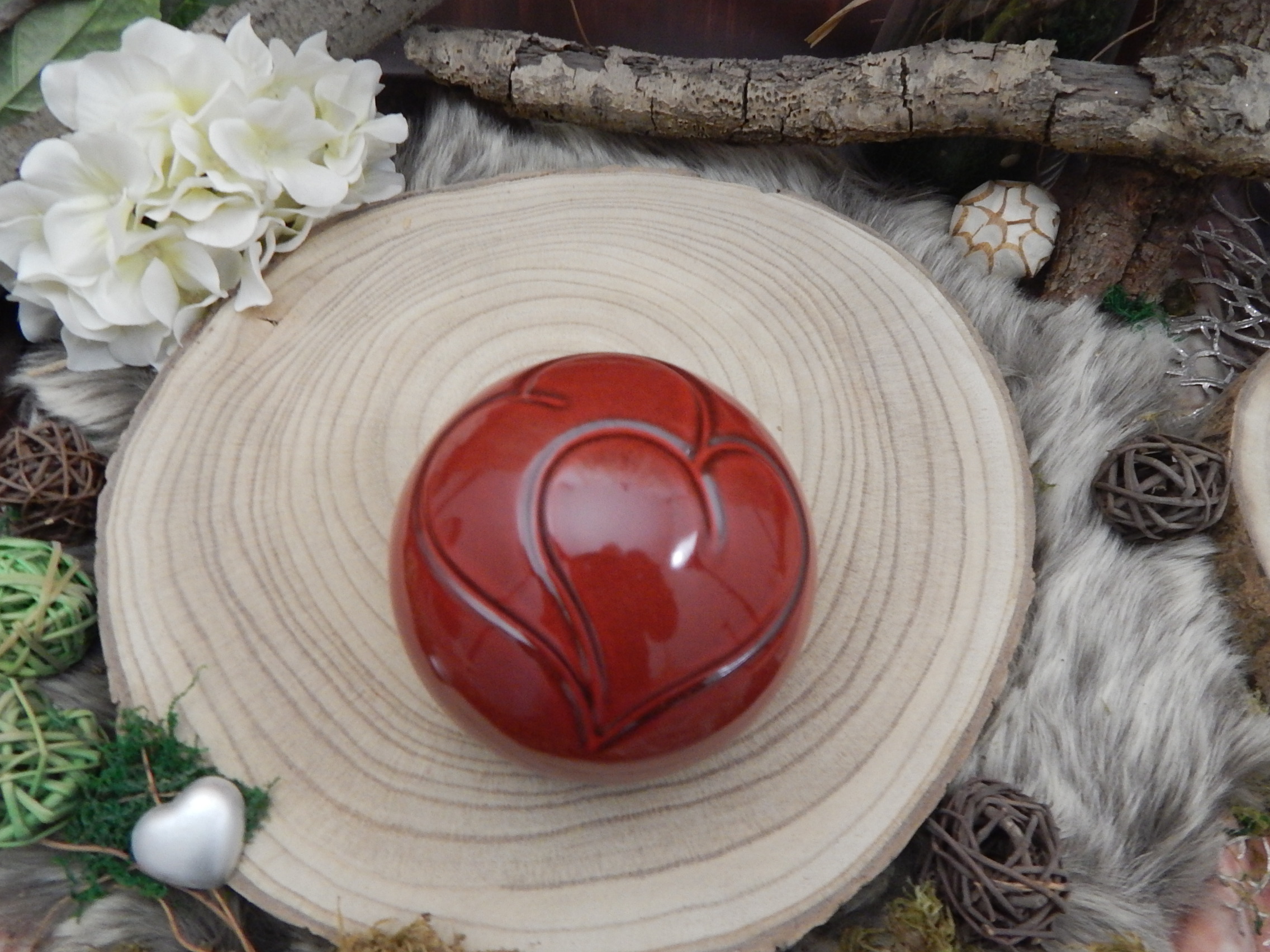 Kugelurne mit Doppelherz in Rot in ca. 0,45 Ltr. (auf Gruppenbild: vorne Mitte) - Aufgrund des hohen Brandes sind Farbabweichungen möglich!